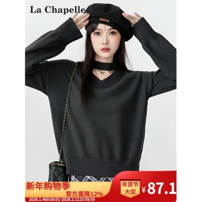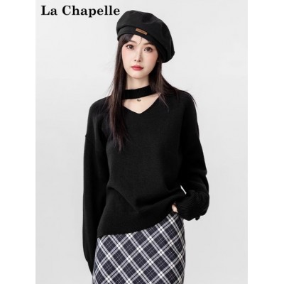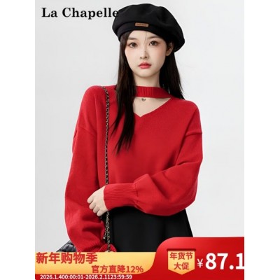 La Chapelle挂脖v领毛衣本命年红氛围感穿搭女秋冬内搭打底衫